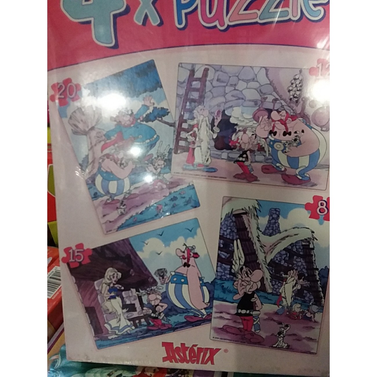 Чудові пазлі з ілюстраціями мультика "Астерікс і Обелікс", 4 різновиди різних картинок і різної складності складання в 1 коробці.