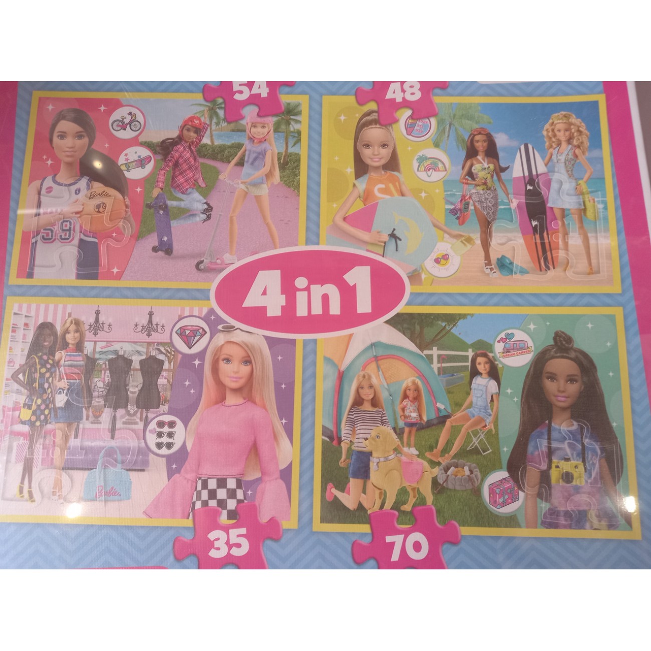 Чотири різні пазли та картинки з Барбі в 1-й коробці, кількість елементів коливається від меншої до більшої: 35, 48, 54 та 70 деталей. Гарна якість елементів, виробник Польща