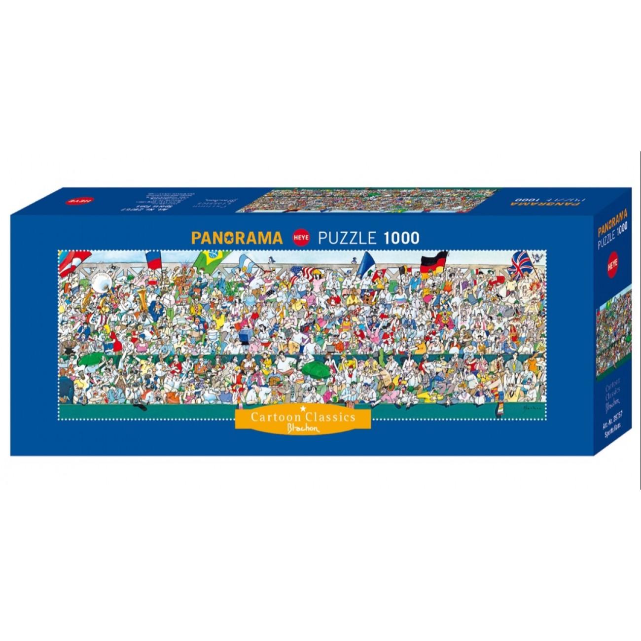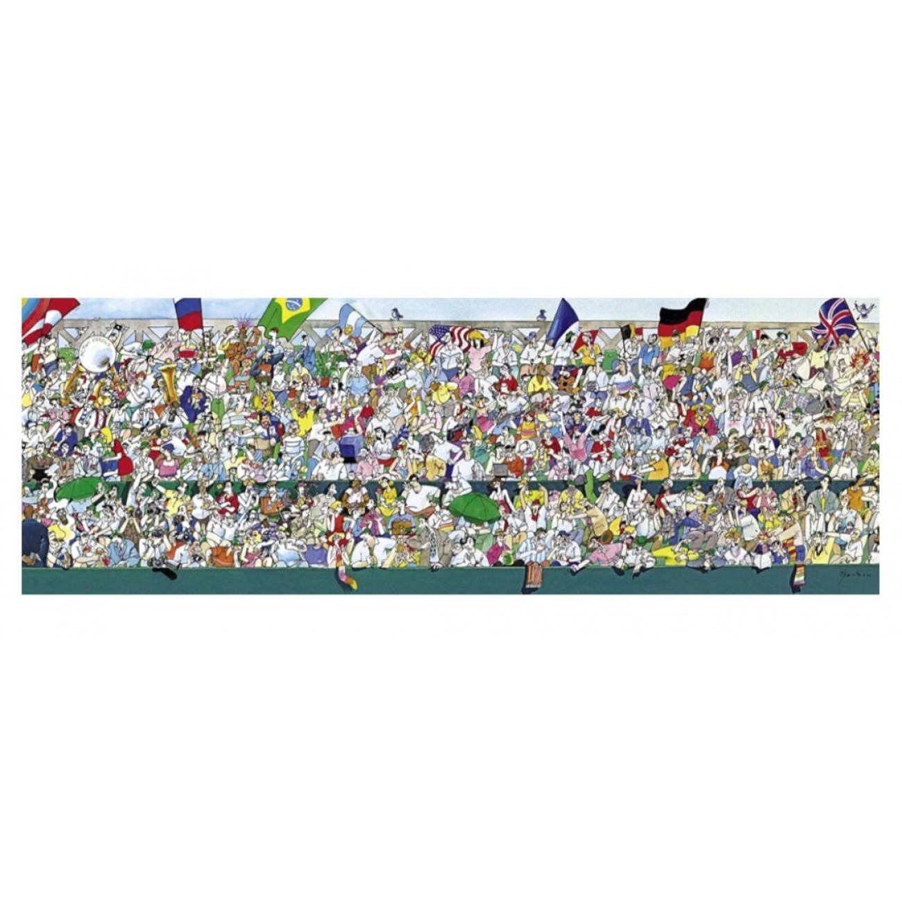 Любите спорт, але не хочете бігати? Тоді цей пазл саме для вас! Панорамаts Fans" від легендарного карикатуриста Роджера Блахона (Blachon) вас у самий епіцентр подій, де кожен сантиметр заповнений гумором та щирими емоціями. Тут змішалося все: прапори різних країн, оркестри, фанати з мегафонами та сотні кумедних ситуацій. Складати його — це наче дивитися комедійний матч! Завдяки широкому формату, ви отримуєте справжню «стадіонну» картинку, яку після складання захочеться розглядати годинами. Забудьте про великі однотонні ділянки неба чи трави. Тут кожна деталь — це окремий персонаж або яскравий прапор. Складання йде на одному диханні!
