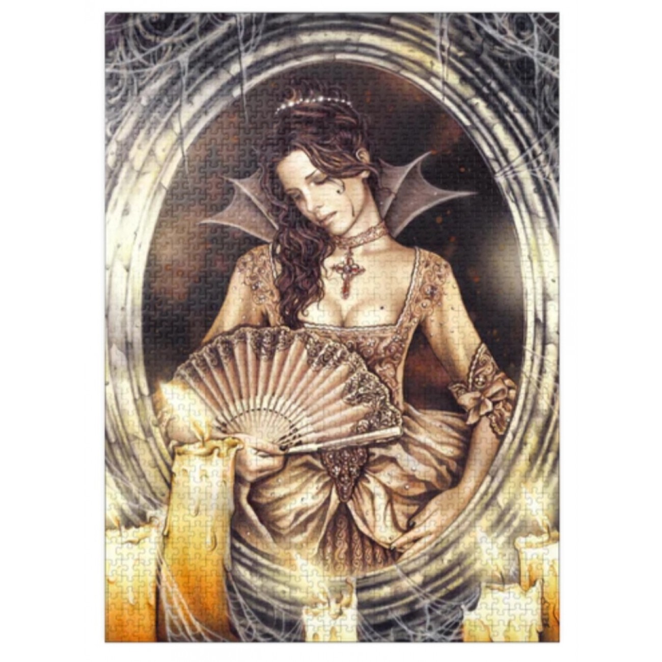 Пазл є частиною ексклюзивної колекції/b> створеної за мотивами робіт відомої іспанської художниці Вікторії Франсес. Сюжет має назву "Portrait") і входить до легендарної готичної серіїe. На ілюстрації зображена таємнича красуня в розкішній сукні з віялом у руках, чий образ оповитий м'яким світлом свічок. Цей витвір Вікторії Франсес переносить у світ темних казок, де краса поєднується з меланхолією та містикою.готовляється за сучасними стандартами друку, що забезпечує надзвичайну чіткість кожної деталі та насиченість кольорів, перетворюючи процес збирання на справжню художню подорож.ктеристики: