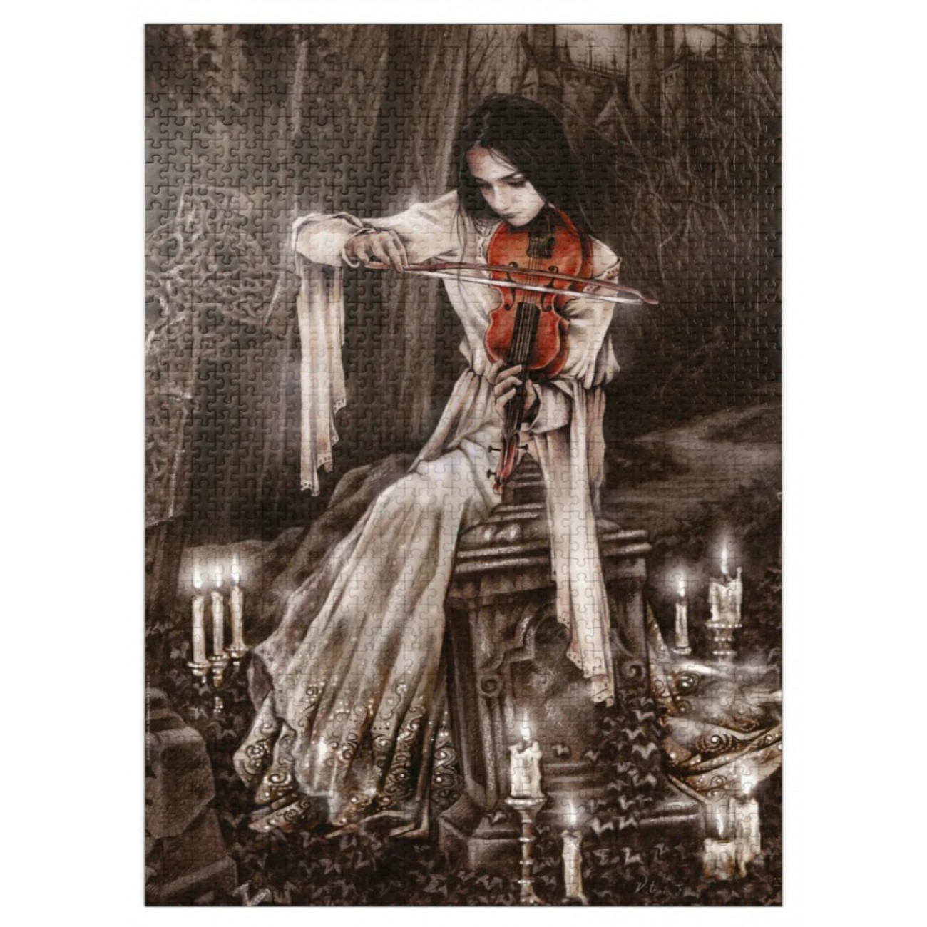 Відчуйте глибину готичного романтизму з преміальним виданням колекційної лінійки/b>, що представляє одну з найбільш знакових робіт іспанської художниці Вікторії Франсес із серії Favole: in"). На ілюстрації зображена таємнича дівчина в білому вбранні, яка грає на червоній скрипці серед похмурої величі стародавнього склепу, оточеного свічками. Контраст яскраво-червоного інструмента на тлі монохромного оточення створює потужний візуальний акцент, сповнений меланхолії та таємної музики.