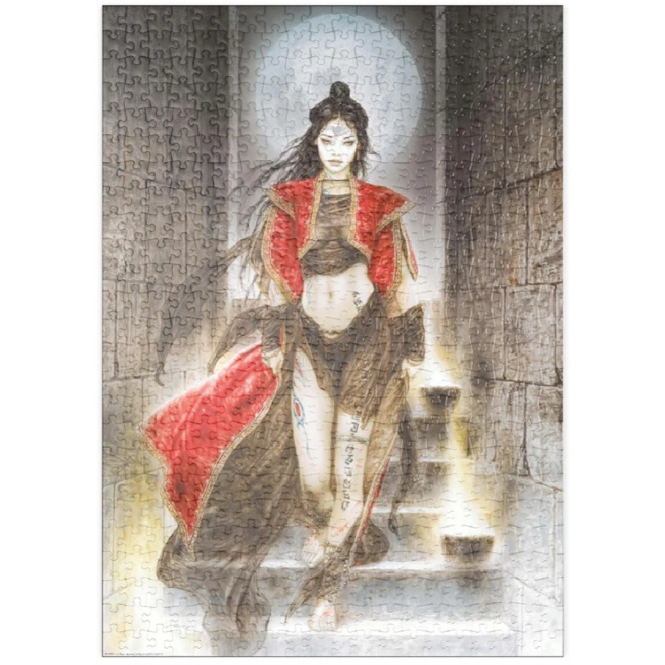 Відчуйте магію темної романтики та неперевершену деталізацію від майстра ілюстрації Луїса Ройо. Цей пазл — справжній виклик для колекціонерів та фанатів жанру фентезі. Образ загадкової дівчини на фоні повного місяця та стародавніх кам'яних сходів створює атмосферу, що заворожує.> Характеристики: