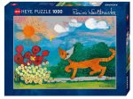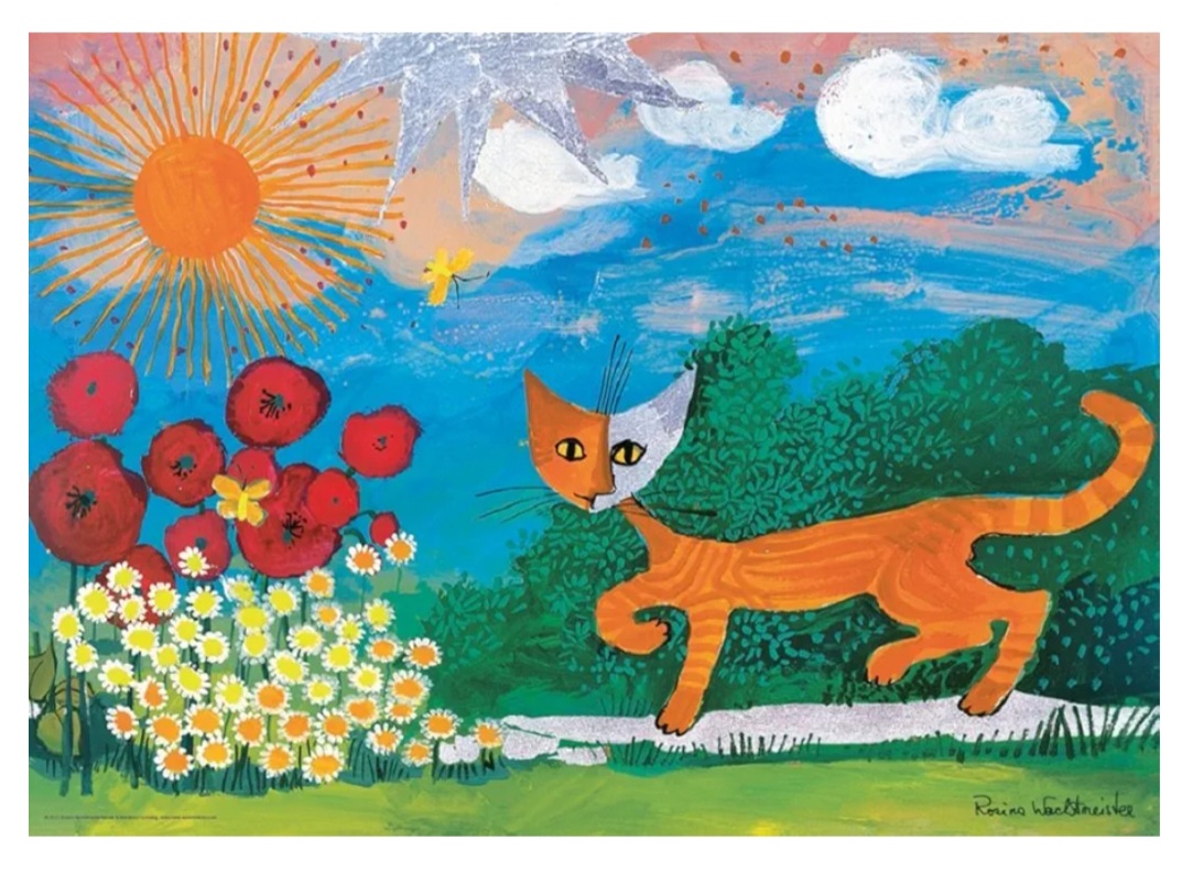 Пазли німецького виробника Heye із серії Rosina Wachtmeister — це колекція художніх мозаїк за мотивами робіт австрійської художниці Розіни Вахтмайстер. Її впізнаваний стиль характеризується яскравими кольорами, наївним мистецтвом та особливою любов’ю до зображення котів із серпоподібними головами. Ці пазли виділяються преміальною якістю друку з використанням насичених пігментів. Багато моделей прикрашені золотою або срібною фольгою, що надає готовому зображенню металевого блиску.